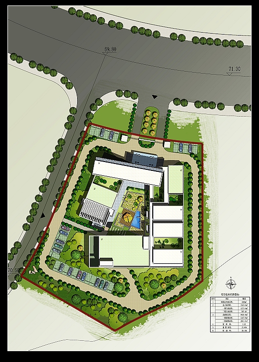 基地總用地面積為6353平方米。結(jié)合基地的地貌特征,確定梯形建筑控制線,布置“T”型的綠地軸于此形成呼應(yīng),總體布局根據(jù)綠地軸線布置,形成了多形態(tài)的空間組合。