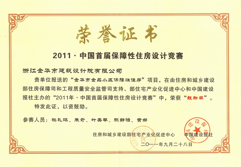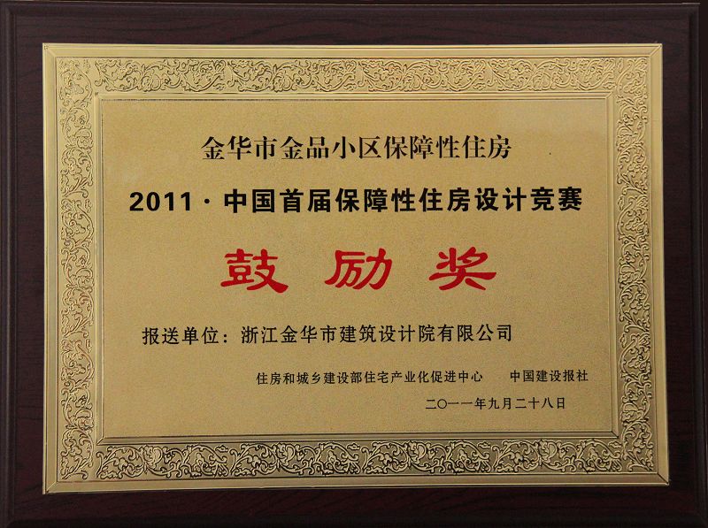 本院設(shè)計(jì)的“金品小區(qū)保障性住房”在住房和城鄉(xiāng)建設(shè)部舉辦的“2011年·中國首屆保障性住房設(shè)計(jì)競賽”中獲獎(jiǎng),并于第十屆中國國際住宅博覽會上舉行頒獎(jiǎng)典禮。本次競賽的主題定為“以人為本,安居樂業(yè)”。旨在更好的推廣優(yōu)秀的保障性住房規(guī)劃設(shè)計(jì)方法,促進(jìn)保障性安居工程設(shè)計(jì)和建設(shè)的標(biāo)準(zhǔn)化和模數(shù)化。